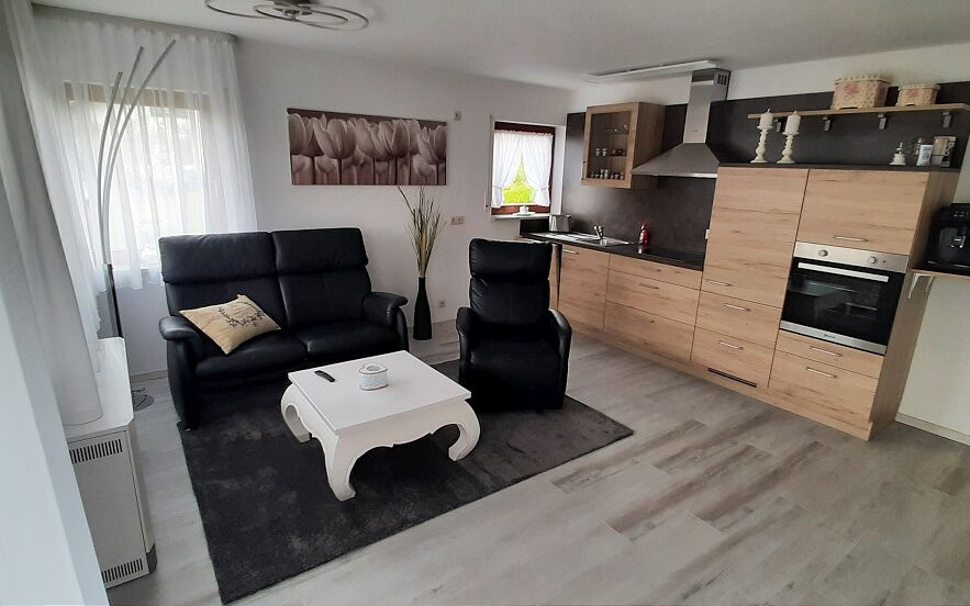 Gemütliche Couchgarnitur, Essecke, voll ausgestattete Küchenzeile mit Geschirrspüler und Kaffeevollautomat, SAT-TV, WLAN, Telefon.